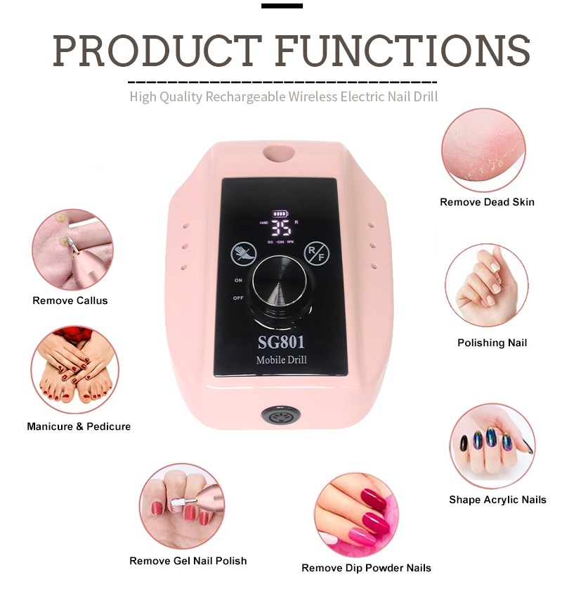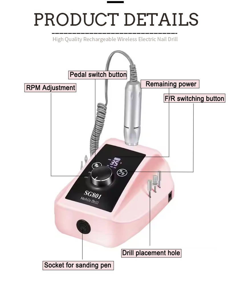 Ennek a 35 000 fordulat/perc fordulatszámú elektromos hordozható zselés körömfúró kijelzőjének kialakítása be-/kikapcsolóval és előre/hátra forgatással rendelkezik, összesen egy gombos aktiváláshoz, gyorstöltő aljzattal az alján, cserélhető fúróaljzattal a tetején, és három fokozatban állítható fordulatszámmal, hogy különféle igényeket kielégítsen.