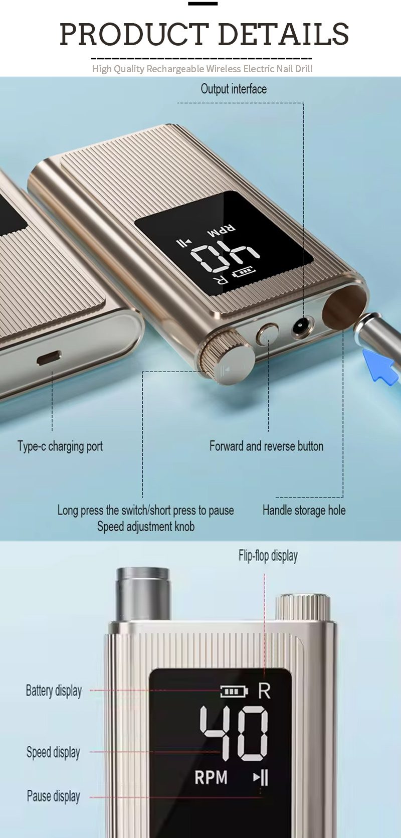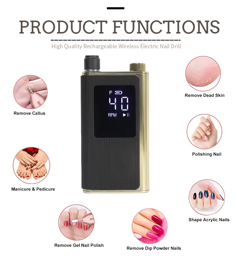 Ennek a 40 000 fordulat/perc fordulatszámú, nagy sebességű professzionális körömfúró kijelzőjének kialakítása be-/kikapcsolóval és előre/hátra forgatással rendelkezik az összesen egy gombos aktiváláshoz, alul gyorstöltő csatlakozóaljzattal, felül cserélhető fúróaljzattal, valamint három fokozatban állítható fordulatszámmal, hogy különféle igényeket kielégítsen.