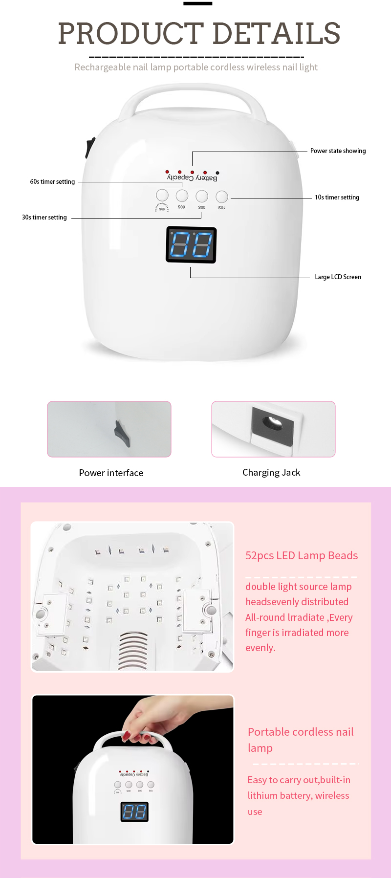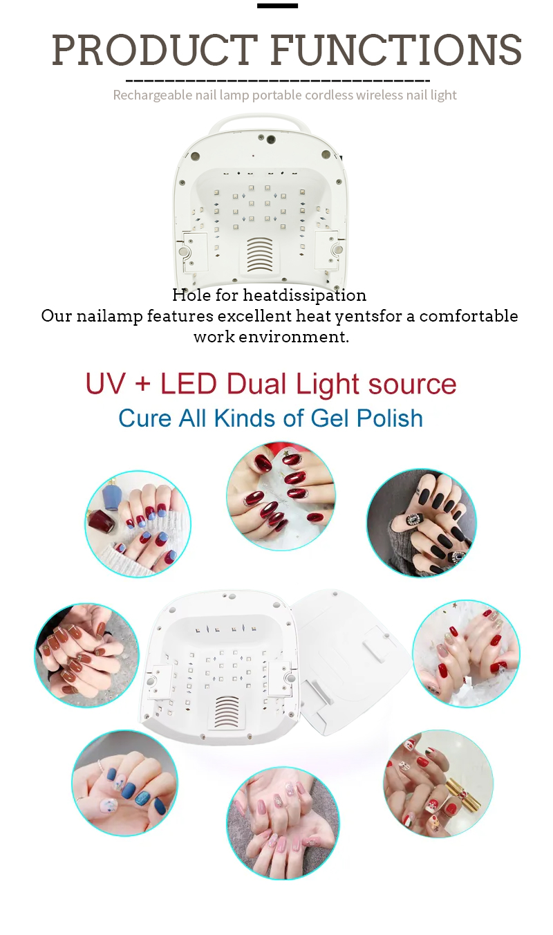 A termék biztosítja a ragasztó szárítását is zsugorodás nélkül. Kettős fényforrásai gyengéd fűtést biztosítanak a kéz elszíneződésének és a szem feszültségének megakadályozására, mind a kéz, mind a lábak számára, és rendkívül gyors szárítási eredményeket eredményeznek.