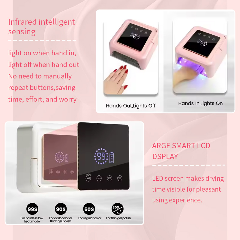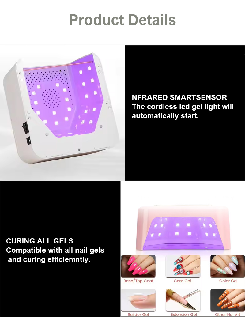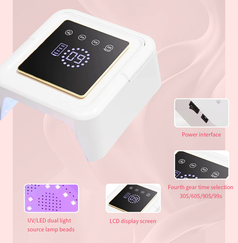 Ez a kiváló minőségű zselés körömlakk gyorsan száradó lámpa egyenletes ragasztószáradást biztosít zsugorodás nélkül. Kettős fényforrása gyengéd melegítést biztosít, hogy megakadályozza a kéz elszíneződését és a szem megerőltetését, így kézre és lábra egyaránt alkalmas, rendkívül gyors száradást biztosítva.