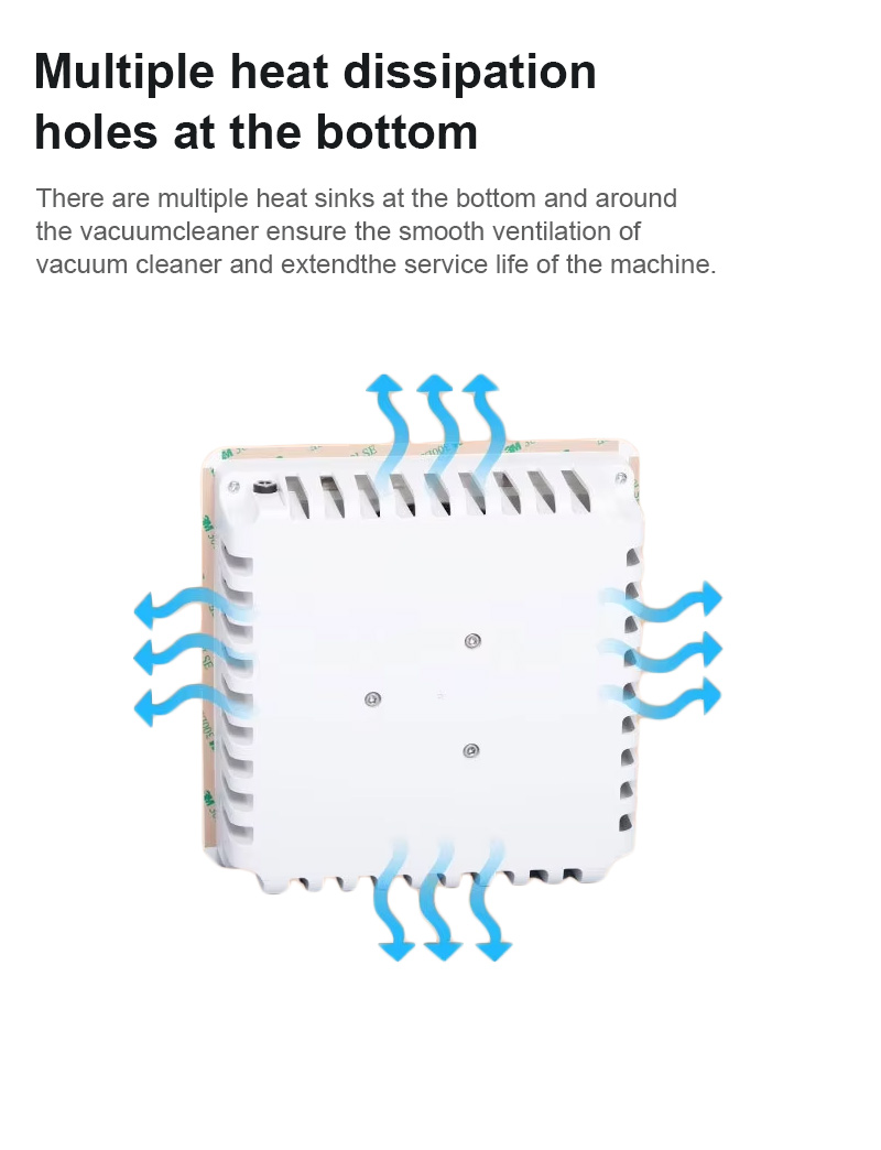 A termék alján hűtőnyílások vannak a sima szellőzés érdekében, a porszívó pedig több hűtőnyílással van kialakítva az alján és körös-körül a sima szellőzés biztosítása és a gép élettartamának meghosszabbítása érdekében.