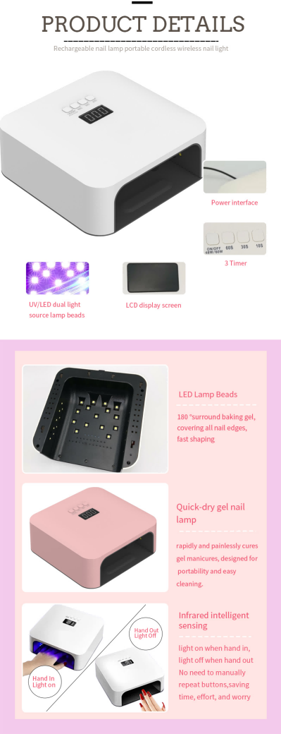 A kiváló minőségű gyors körömszárító lámpa egyenletes ragasztószáradást biztosít zsugorodás nélkül. Kettős fényforrása gyengéd melegítést biztosít, hogy megakadályozza a kéz elszíneződését és a szem megerőltetését, így kézre és lábra egyaránt alkalmas, rendkívül gyors száradást biztosítva.