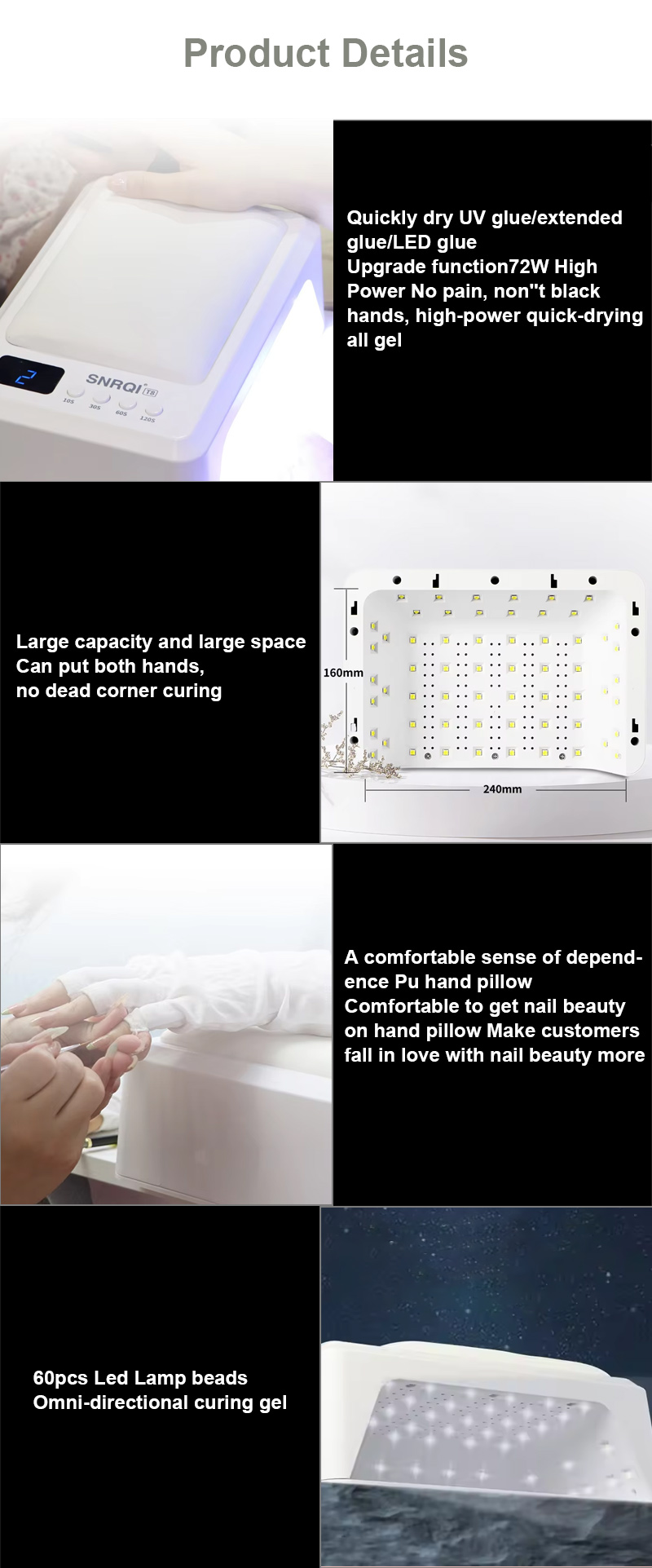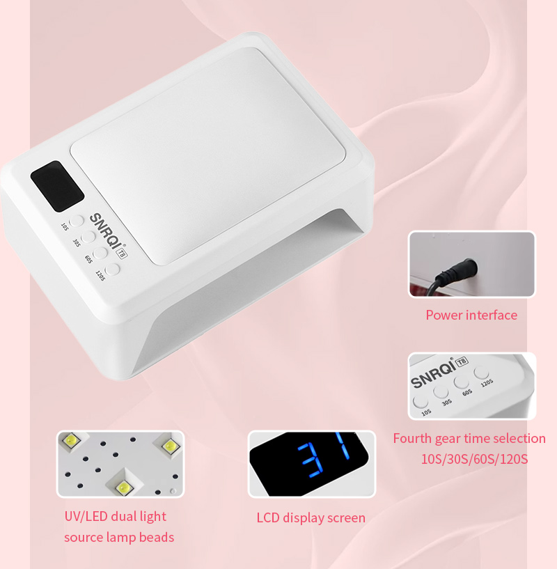 A termék egyenletes ragasztószáradást biztosít zsugorodás nélkül. Kettős fényforrása gyengéd melegítést biztosít, hogy megakadályozza a kéz elszíneződését és a szem megerőltetését, így kézre és lábra egyaránt alkalmas, rendkívül gyors száradást biztosítva.