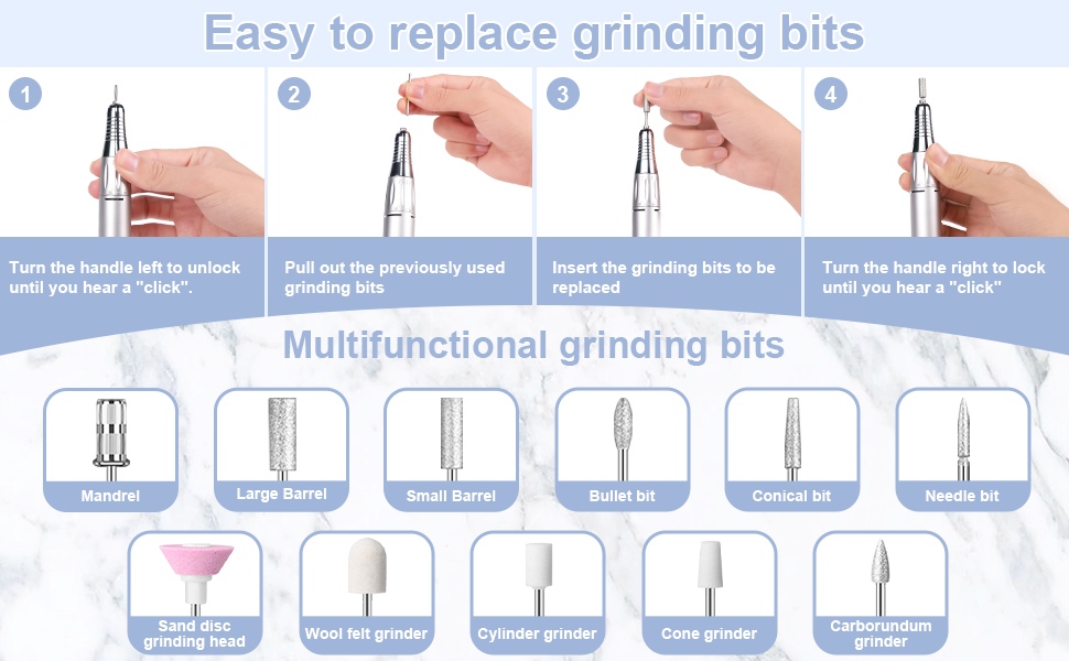 Ez az alacsony zajszintű hordozható körömfúrókészlet cserefúró működési mód, azaz dugja ki és húzza ki, egyszerű és kényelmes, a csere a befejezés után használható.