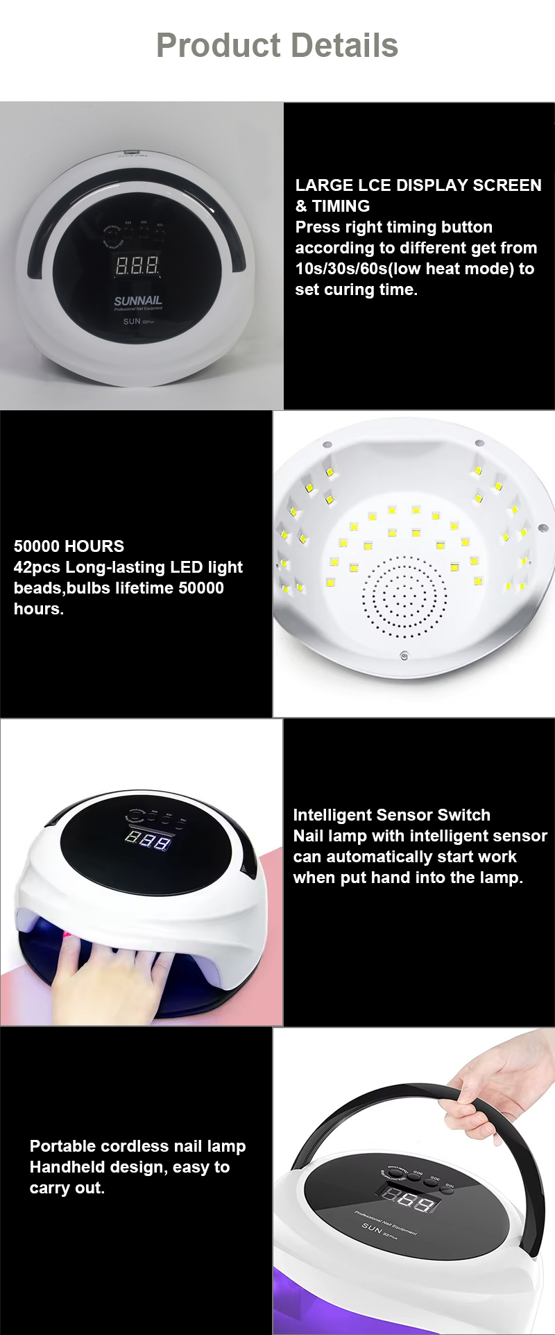 Az automatikus érzékelő funkcióval rendelkező körömszárító lámpa infravörös intelligens érzékelési technológiával rendelkezik, amely automatikusan világít, amikor a kéz közeledik, és kikapcsol, ha a kezek távolodnak – így kiküszöböli a gombok többszöri megnyomásával járó gondot, és időt és energiát takarít meg. A nagy teljesítményű sütőragasztó nem igényel hosszas várakozást, időt és erőfeszítést takarít meg.