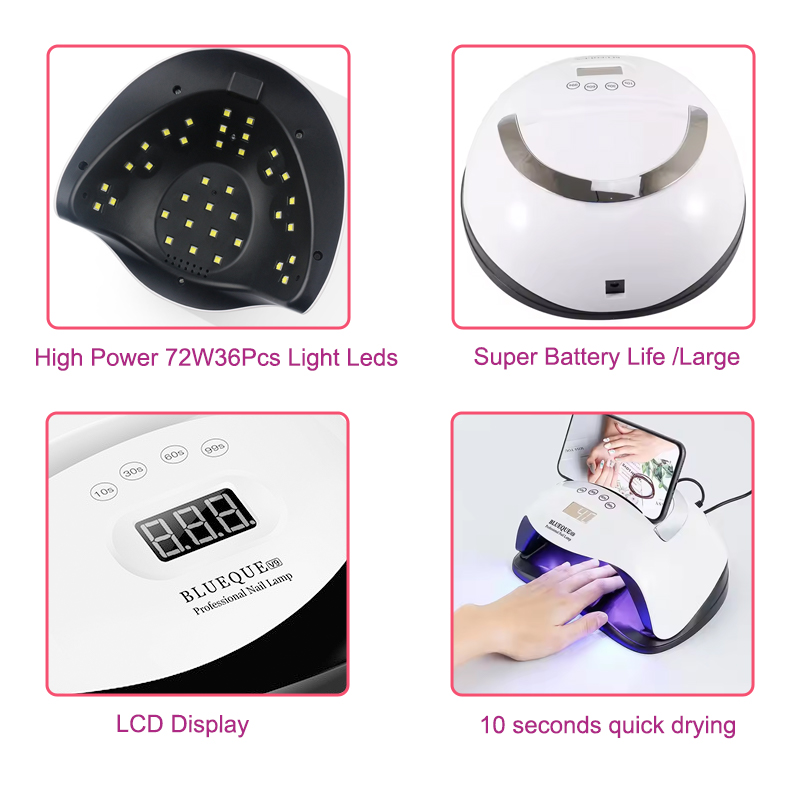 A termék egyenletes ragasztószáradást biztosít zsugorodás nélkül. Kettős fényforrása gyengéd melegítést biztosít, hogy megakadályozza a kéz elszíneződését és a szem megerőltetését, így kézre és lábra egyaránt alkalmas, rendkívül gyors száradást biztosítva.