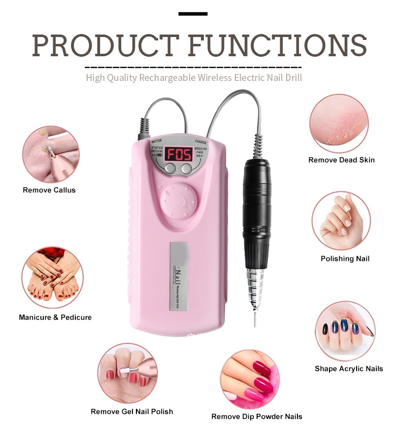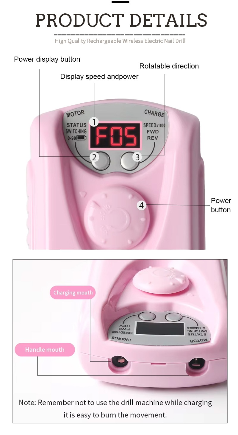 Ennek a professzionális akkus elektromos körömfúrónak a kijelzője be-/kikapcsolóval és előre/hátra forgatással rendelkezik az összesen egy gombos aktiváláshoz, alul gyorstöltő csatlakozóaljzattal, felül cserélhető fúrócsatlakozóval, valamint három fokozatban állítható fordulatszámmal, hogy különféle igényeket kielégítsen.