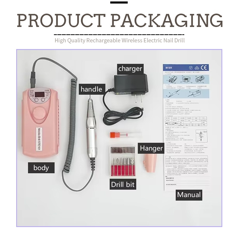 A professzionális akkumulátoros elektromos körömfúró-csomag tartalma egy csiszolótoll terméket, egy USB töltőkábelt, egy termék használati útmutatót, valamint egy könnyű és hordozható dobozt tartalmaz.