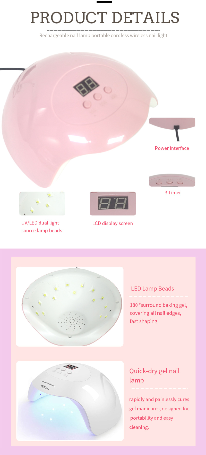 A termék biztosítja a ragasztó szárítását is zsugorodás nélkül. Kettős fényforrásai gyengéd fűtést biztosítanak a kéz elszíneződésének és a szem feszültségének megakadályozására, mind a kéz, mind a lábak számára, és rendkívül gyors szárítási eredményeket eredményeznek.
