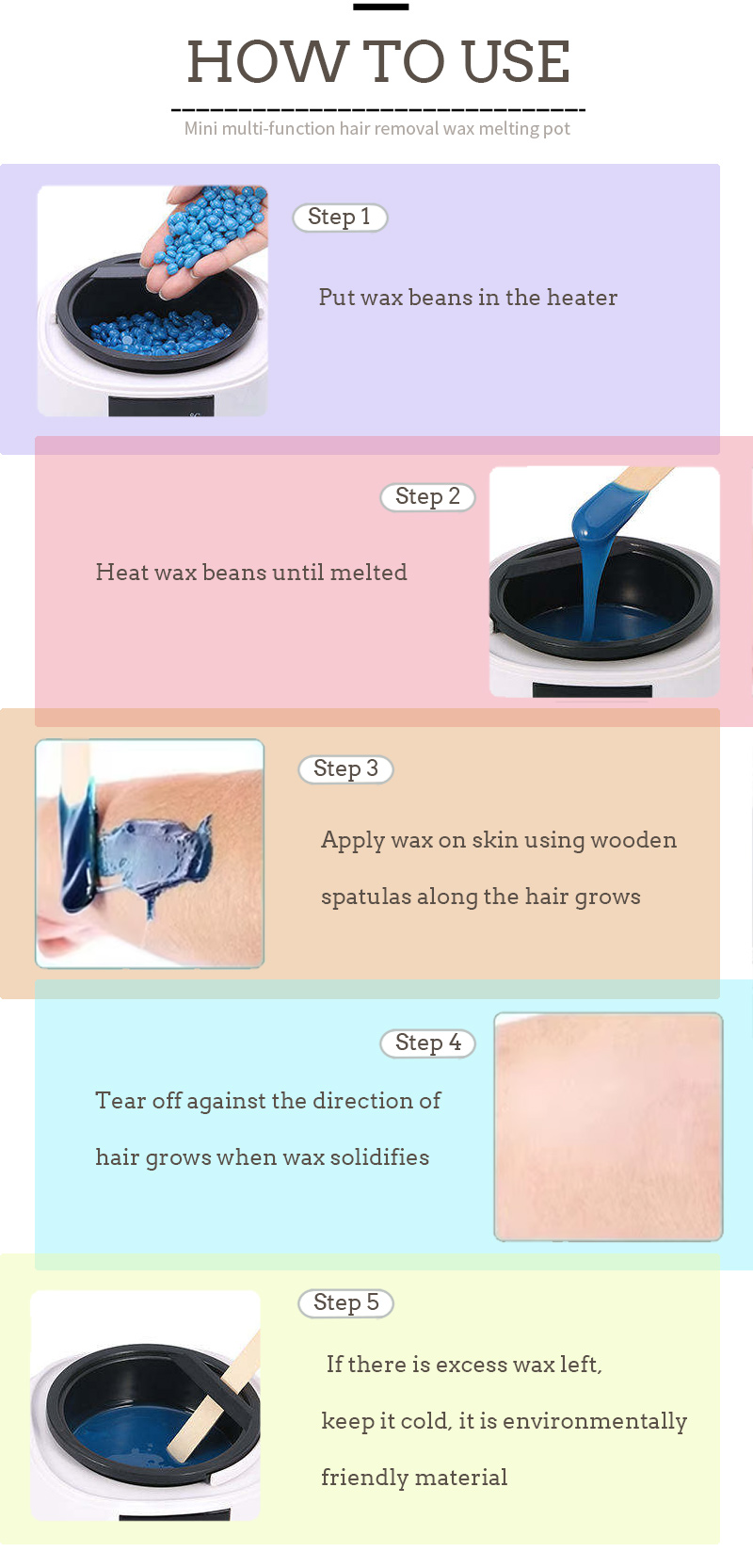 A termék szőrtelenítő viaszos műveleti módja, minél magasabb a hőmérséklet, annál gyorsabban olvad a viasz, minél alacsonyabb hőmérsékleten, annál lassabban olvad a viasz, először a megfelelő mennyiségű szőrtelenítő viaszbabba öntjük, melegítjük, amíg a viaszbab elolvad, majd az egyenletes bevonatú szőrtelenítő viasz szőrtelenítő részeit, végül a szőrnövekedés irányával ellentétesen leszakad.